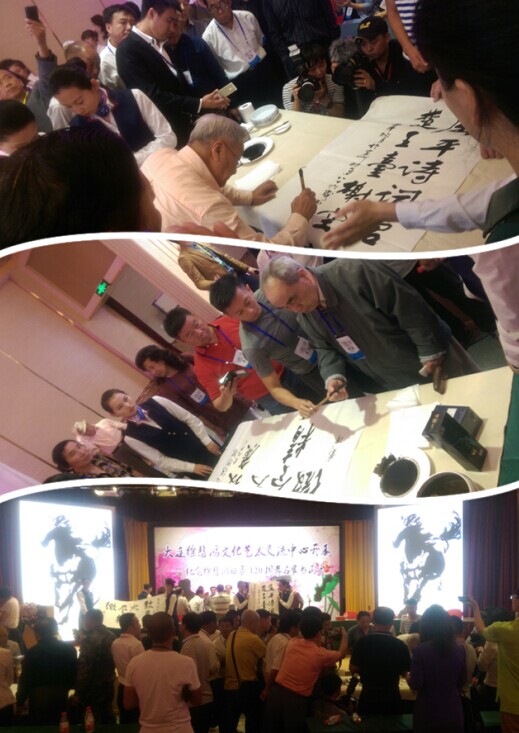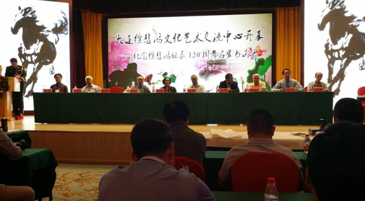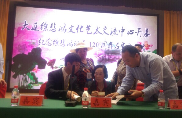 开幕式当天,徐悲鸿夫人——93岁的廖静文先生及其子徐庆平携众多大师来连现场泼墨,共同纪念徐悲鸿诞辰120周年。徐悲鸿,作为中国著名国画家、油画家,画“马”名家,是中国现代美术事业的奠基者之一,中国国画改革先驱者,被誉为“现代中国绘画之父”。徐悲鸿出身贫寒,自幼随父亲徐达章学习诗文书画。1919年赴法国留学,1927年回国,先后任上海南国艺术学院美术系主任、中央大学艺术系教授、北京大学艺术学院院长。1933年起,先后在法国、比利时、意大利、英国、德国、前苏联举办中国美术展览和个人画展。抗日战争爆发后,在中国香港、新加坡、印度举办义卖画展,宣传支援抗日。徐悲鸿的作品融古今中外技法于一炉,显示了极高的艺术技巧和广博的艺术修养。