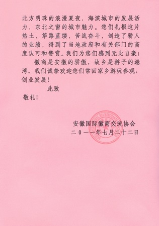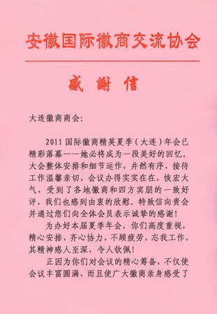 安徽国际徽商交流协会给大连徽商商会写的感谢信