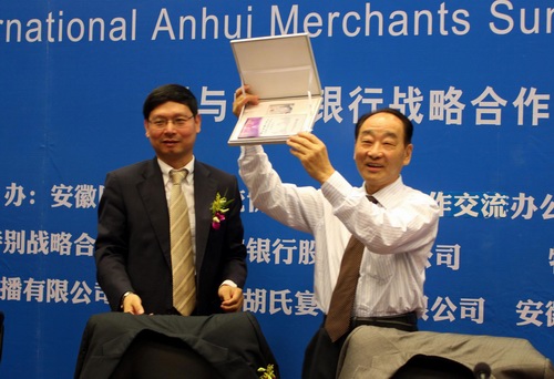 安徽省人大原副主任、安徽国际徽商交流协会名誉会长吴昌期给中国银行总行个人金融总部总监高树钢颁发第二届理事会高级顾问证书