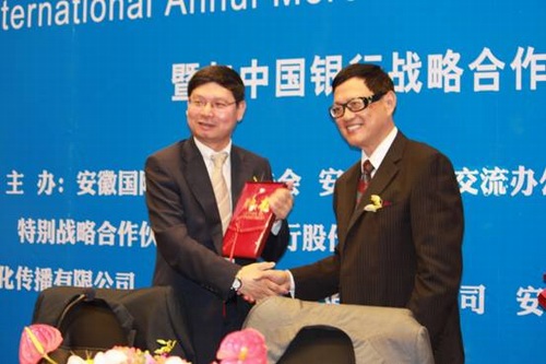 中国银行总行个人金融部总监高树钢先生向安徽国际徽商交流协会会长周本立先生赠送首批“中银财富管理•徽商卡”