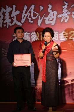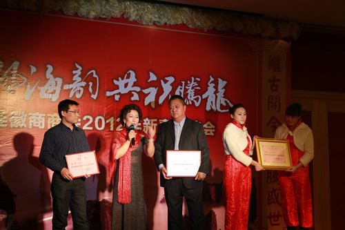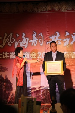 谢谢小耿再一次给我们带来的欢快美妙歌曲,接着这个歌本次年会将进入表彰环节,历史的徽商是中国十大商帮之首,今天的徽商正在崛起,在当今改革开放的大潮中,千万徽商活跃在神州大地上,大连徽商商会今年工作成绩显著,在广西南宁徽商国际精英年会上,我们徽商商会满载而归,首先是在全国56个商会中,大连徽商商会被评为“先进徽商商会”的光荣称号。同时,我们大连徽商商会有两名企业家被评为“中华百名优秀徽商”他们是: