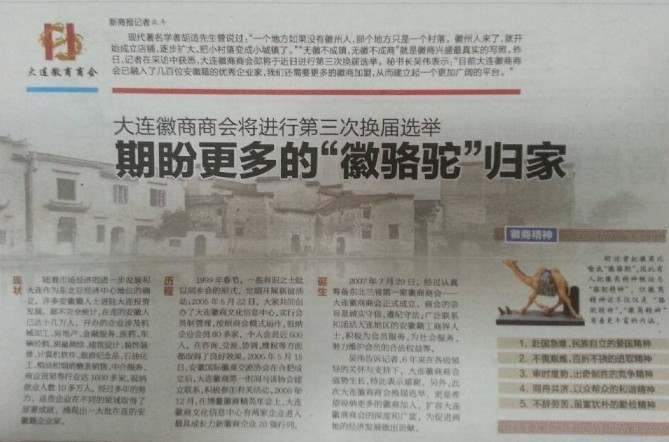 现代著名学者胡适先生曾说过:“一个地方如果没有徽州人,那个地方只是一个村落。徽州人来了,就开始成立商铺,逐步扩大,把小村落变成小城镇了。”“无徽不成镇,无徽不成商”就是徽商兴盛最真真实的写照。昨日,记者在采访中获悉,大连徽商商会即将于近日进行第三届换届选举。秘书长吴伟表示:“目前大连徽商商会已融入了几百位安徽籍的优秀企业家,我们还需要更多的徽商加盟,从而建立起一个更加广阔的平台。”