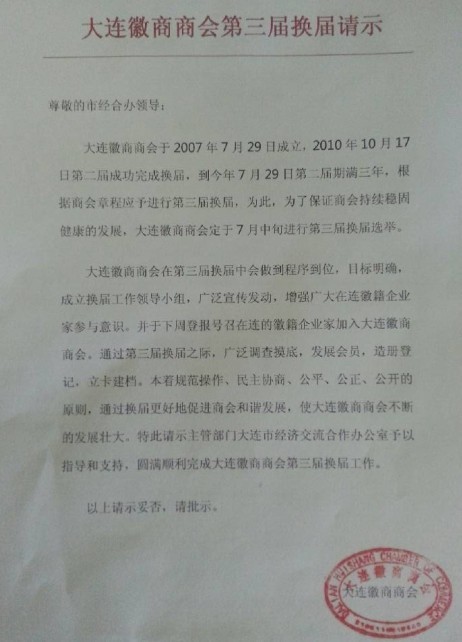 大连徽商商会第三届换届请示