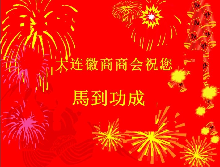 大家春节快乐!我谨代表大连徽商商会,祝福大家身体健康,阖家欢乐,财源广进,幸福吉祥,马到成功!2014年,大连徽商商会将坚持以解决会员困难与开展服务工作做为商会工作的出发点和落脚点;坚持商会工作规范化、效率化做为商会发展的重要方向;坚持资源整合,信息共享做为商会发展的主攻方向;坚持建设学习型商会做为商会发展的强大动力。我们在连的全体徽商,将借“深化改革”的东风,以徽商梦凝聚力量,以改革发展激发活力,用实际行动及企业的进一步发展为大连及家乡安徽经济社会发展做出新贡献。