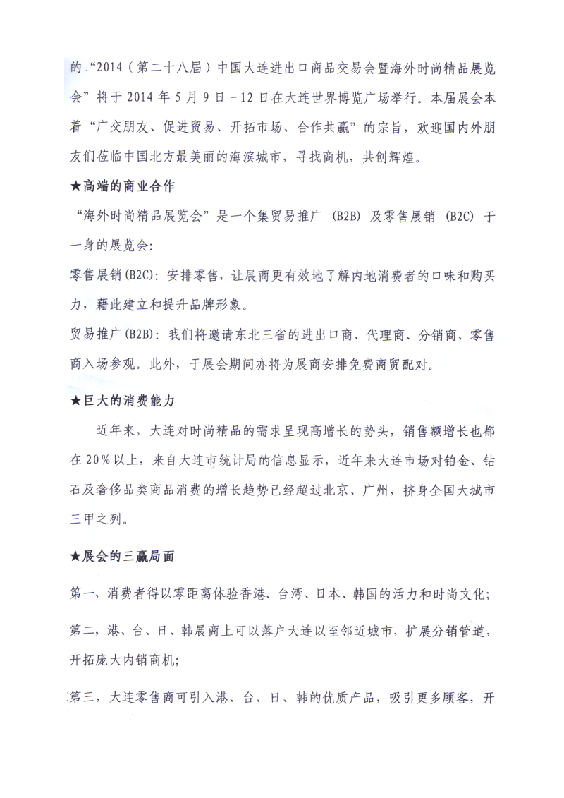为了进一步促进大连与香港、台湾、日本及韩国在文化、经贸上的交流与合作,由大连市人民政府、中国国际贸易促进委员会在市分会主办的“第二十八届(2014年)中国大连进出口商品交易会暨海外时尚精品展览会”,将于2014年5月9日到12日在大连世界博览广场举行。本次座谈会,即向各商会参会人员,报告了展会宗旨、优势、商机及参与办法。