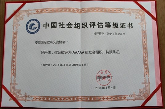 热烈祝贺安徽国际徽商交流协会荣获5A等级
